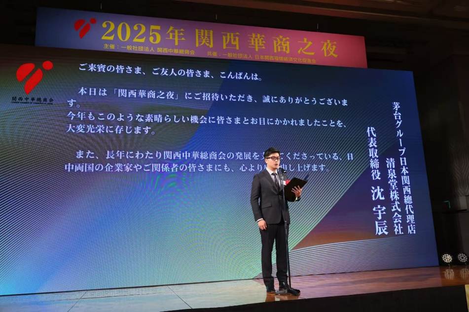 本イベントの開催にあたり協力した企業への感謝状贈呈も行われ、貴州茅台酒 日本関西地区総代理店・清泉堂株式会社の代表より挨拶が述べられました。