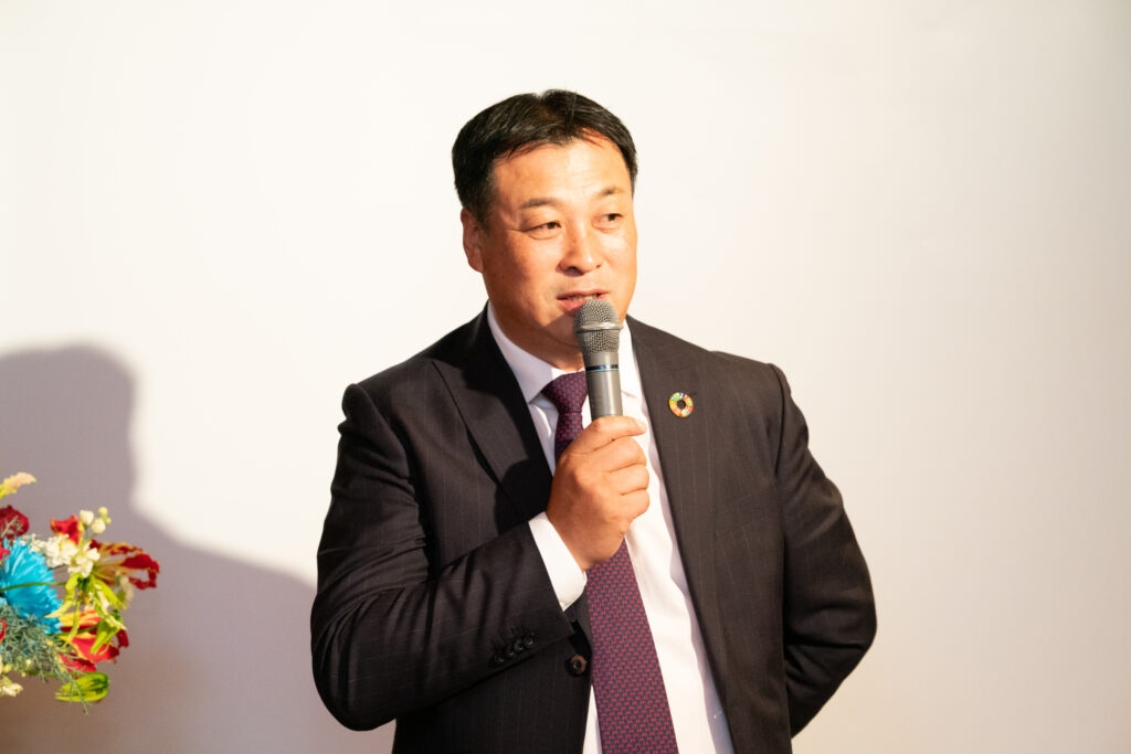 続いて、新会長に就任した金澤宏樹が就任挨拶を行い、会員からの信任に対する感謝を述べるとともに、商会が培ってきた実務重視の姿勢を継承し、結束を強めながら新たな段階での安定的な発展を目指す決意を表明しました。